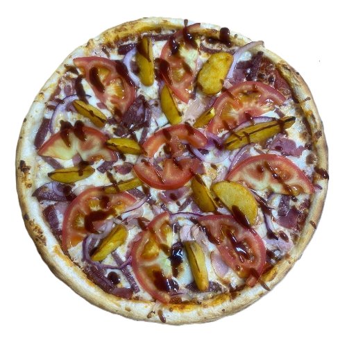 Фирменный красный соус, сыр, бекон, мясной микс, помидор, картофель,лук маринованный