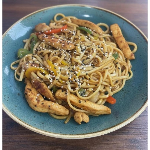 Лапша удон,куриное филе, шампиньон,болгарский перец,красный лук,помидор,соус терияки,кунжут