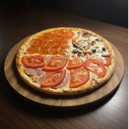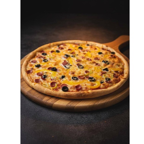 Фирменный красный соус, сыр, мясной микс,карбонат,сладкий перец,шампиньоны,маслины