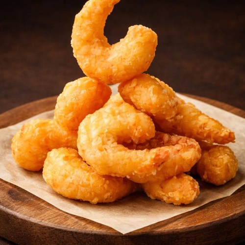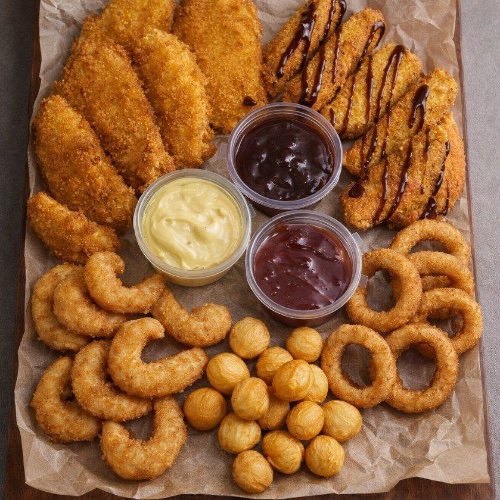 Креветка фри,куриные стрипсы,сырные шарики с халапенью, луковые кольца, крабс фри .три соуса на выбор .