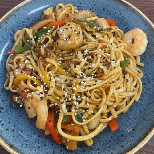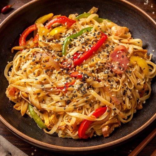 Лапша удон,куриное филе, шампиньон,болгарский перец,красный лук,помидор,соус терияки,кунжут